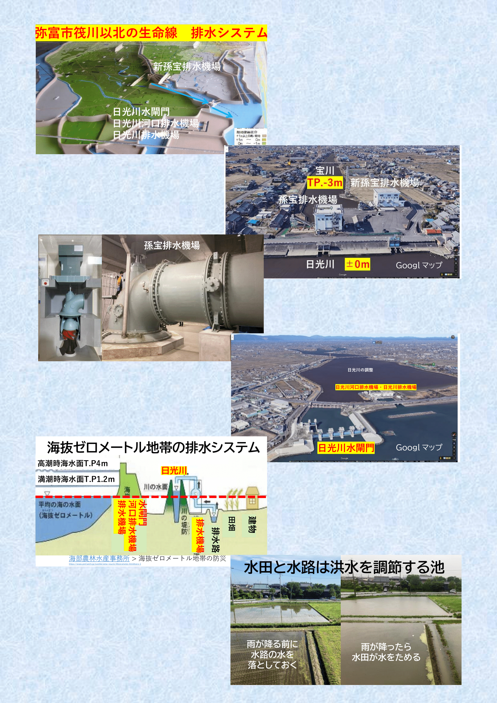 海部地域は、地盤が低く、弥富に降った雨は、巨大なポンプ施設と水閘門(水門)を通さなければ一滴も排水できません。これらの排水施設は、まさに私たちの「生命線」です。