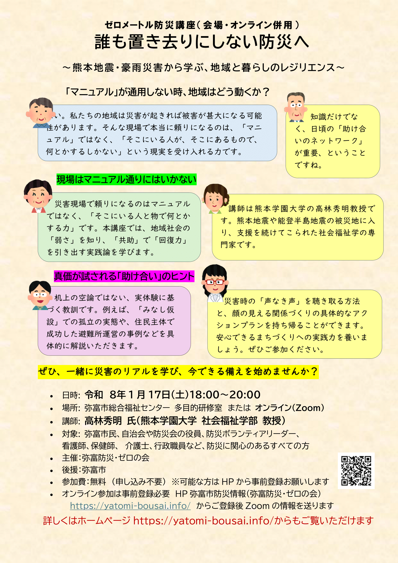 - 対象: 弥富市民、自治会や防災会の役員、防災ボランティアリーダー、看護師、保健師、介護士、行政職員など、防災に関心のあるすべての方
